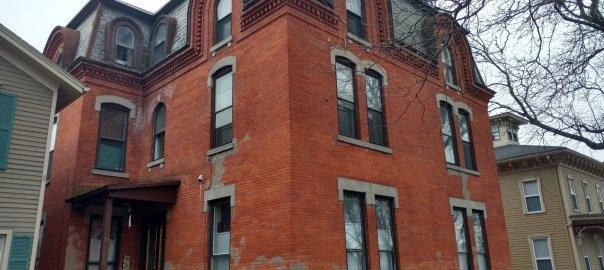 After seeing some other Tuckpointing in Seneca Falls, NY, I was driving past this interesting church and decided to poke around. The small placard says that the stone tower was added in 1882 but I am not sure if all the stone and brick were added then or not. Either way its safe to say that the Tuckpointing is at least this from 1882. This pictures show the masonry elements that reflect similar architecture with tuckpointing in the area, and would fall in line with tuckpointing on churches in the region. The evidence on this façade is slim. However, it is faintly noticed as a bed joint under some of the corbelled brickwork and only a few inches remain around the doorway.